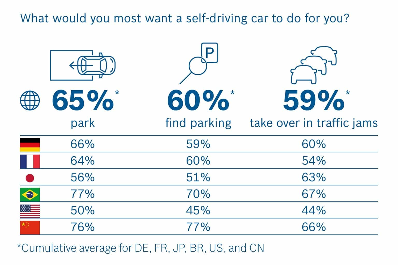 Os brasileiros, com 77% das opiniões, são os que mais anseiam por um carro que estacione sozinho, seguidos pelos chineses, dos quais 76% indicaram a facilidade. Por outro lado, com a enorme profusão de estacionamentos, cidades dotadas de largas avenidas e bairros planejados, apenas a  metade dos motoristas dos Estados Unidos apontaram a função estacionamento como prioridade.