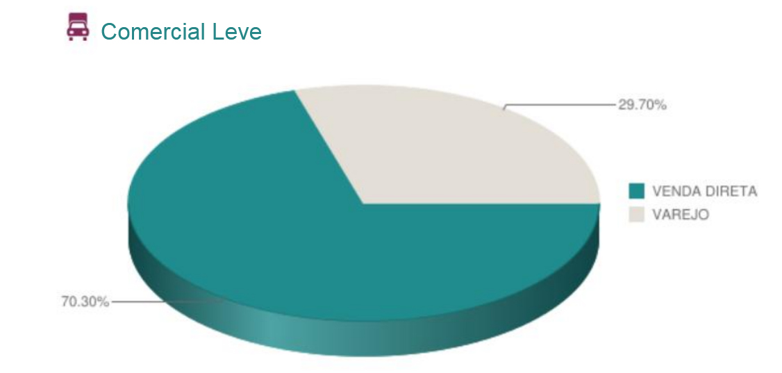 O segmento de comerciais leves, isoladamente, é o mais dependente das vendas diretas. De cada dez veículos vendidos nos primeiros seis meses do ano, sete foram comprados por meio da modalidade, ou seja, 70%. Em 2012, essa relação equivaleu a 47,6% dos negócios e em 2017 a 66,7%.