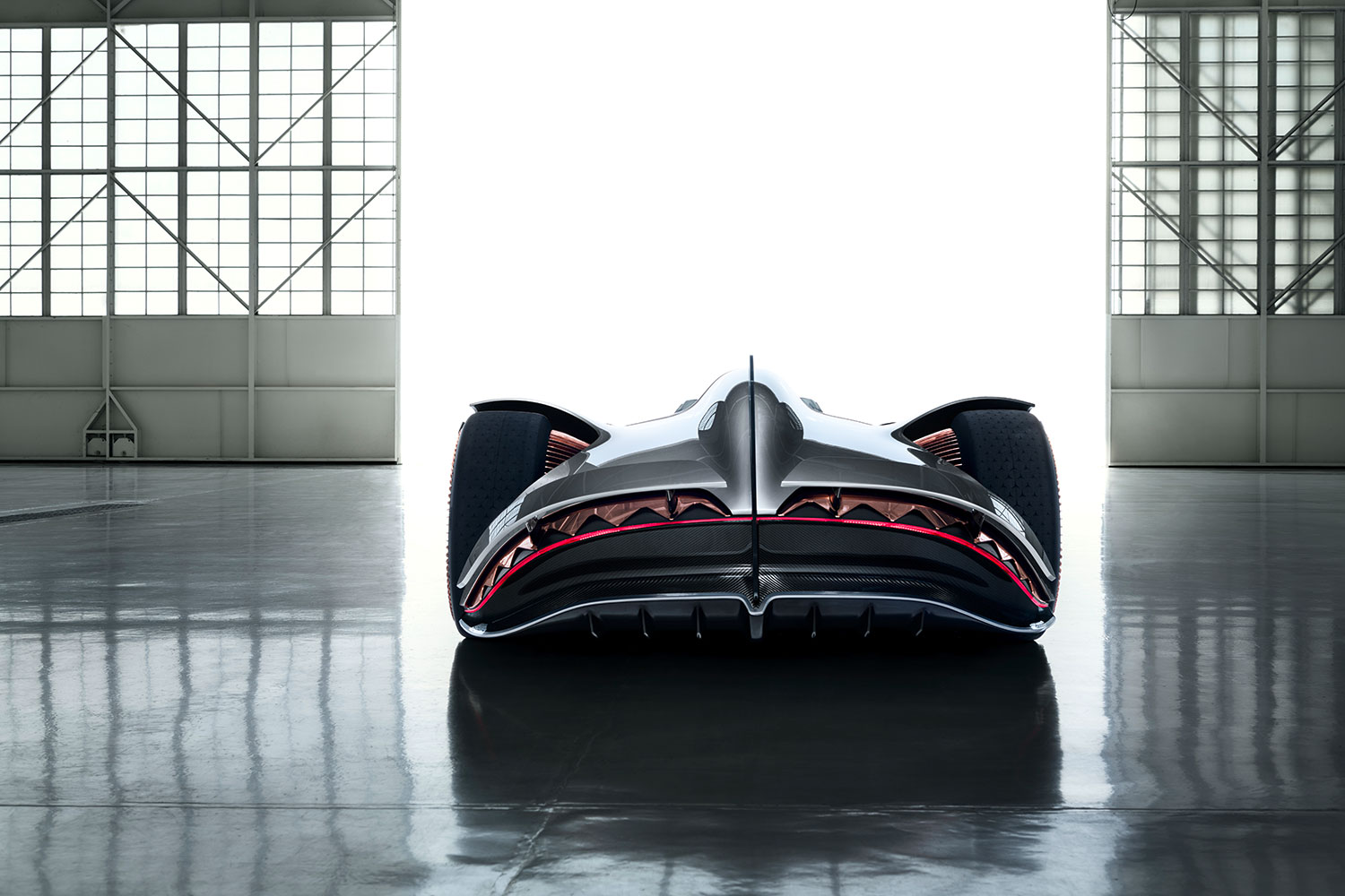 A carroceria do EQ mede 3,5 metros de comprimento e 1 metro de altura. Sua estrutura é em fibra de carbono, assim como algumas peças funcionais, como os defletores de ar. As saias laterais carregam uma faixa luminosa em azul, mesma cor adotada no letreiro retraído posicionado logo atrás das rodas dianteiras e já uma assinatura da linha EQ.