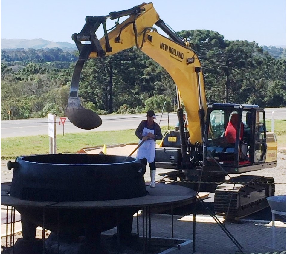 Haja criatividade para preparar uma feijoada gigante, misturando 200 quilos de feijão e 700 quilos de embutidos. Desafio assumido, criatividade foi o que não faltou para os sócios da Iatinho Máquinas, Evelayne e Marcus Iaczuk. A saída foi utilizar uma escavadeira hidráulica para preparar a iguaria, com uma colher devidamente adaptada para fazer jus à gigantesca panela. Foram oito horas de preparo e a garantia de comida farta para mais de 1,5 mil pessoas.