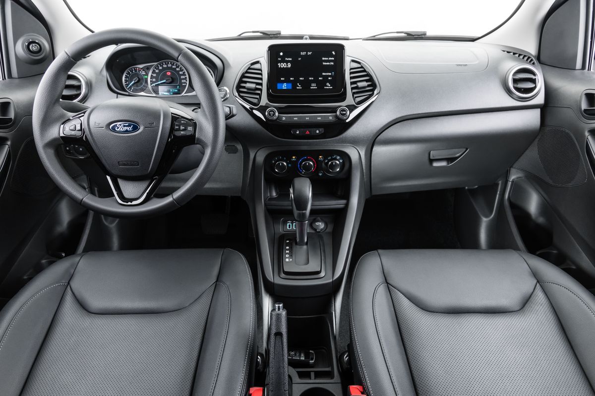 Para o posto de comando, a engenharia providenciou um pacote de conveniências ao motorista. A ignição é do tipo sem chave, basta apertar o botão; o volante multifuncional dá acesso ao sistema de áudio, controlador de velocidade e informações do veículo. No centro do painel, em posição elevada, a tela de 6,5 polegadas sensível ao toque abriga a central multimídia com sistema Sync 3 da marca, permitindo conexão a smartphones e aplicativos de navegação, como o Waze. Há ainda duas entradas USB localizadas no console central.