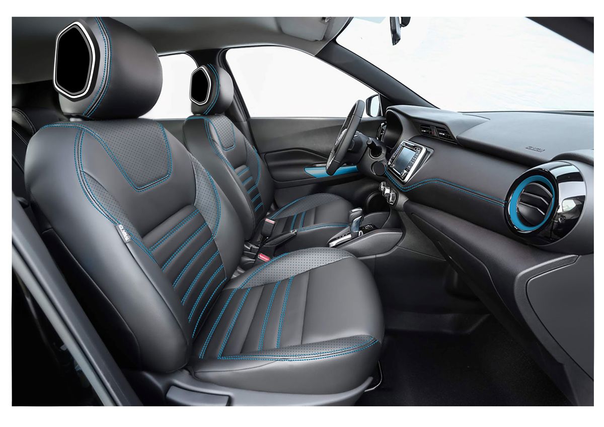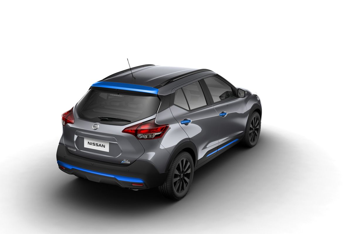 No visual, o Kicks Rhythm se diferencia com detalhes em azul no acabamento externo e interno. Por fora, eles aparecem no entorno da grade, para-choques, teto, maçanetas e nas partes inferiores das portas. Por dentro, o azul está presente nas costuras dos bancos e apoios de cabeça, apoios dos braços nas portas e saídas de ar.