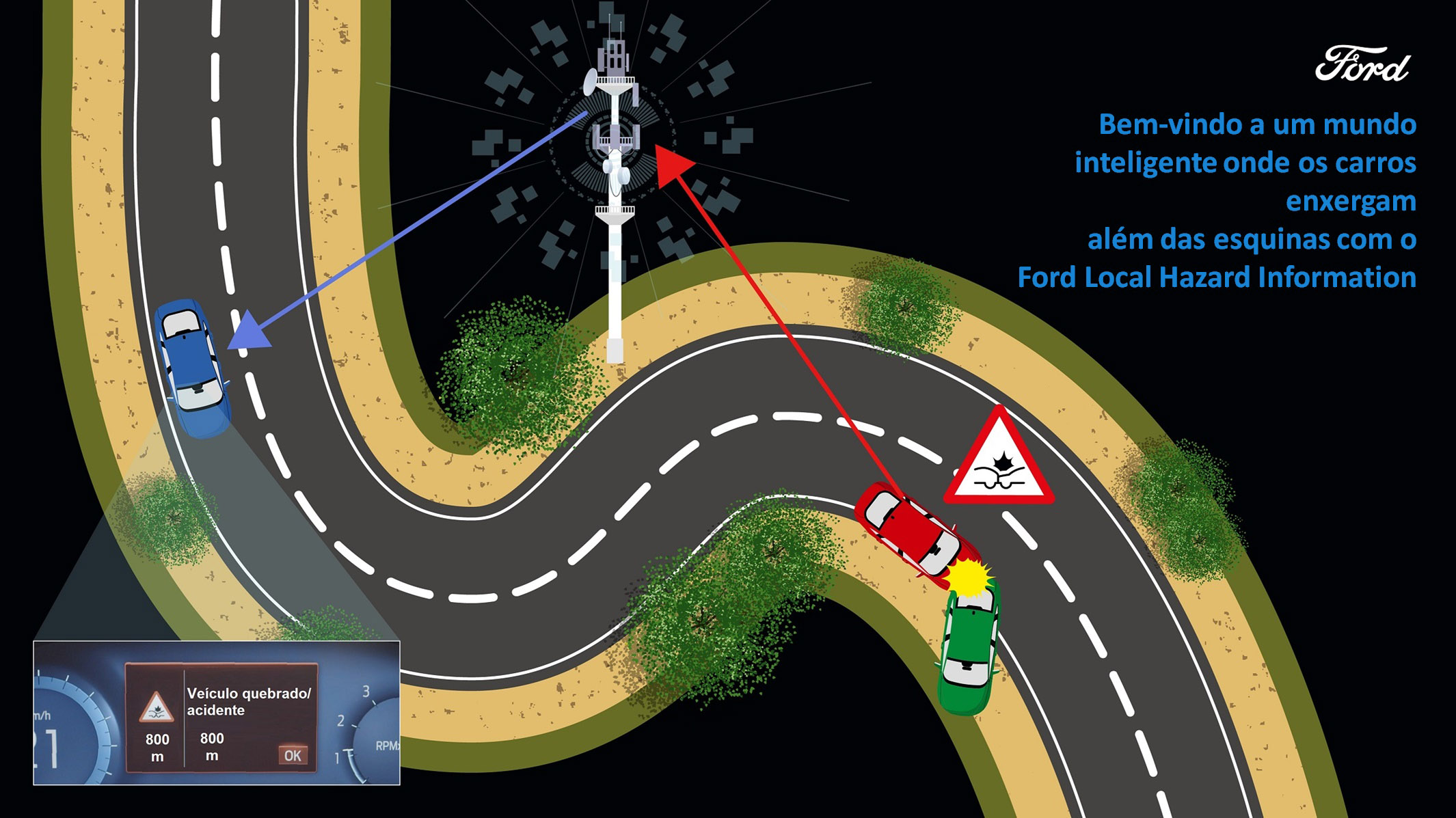 Como saber o que se passa na estrada além de onde o motorista pode enxergar? Ali, logo depois da próxima curva, por exemplo? Tecnologia apresentada pela Ford na Europa garante essa “antevisão” que pode evitar muitos acidentes, fatais ou não. Batizado de LHI, sigla para Local Hazard Information, ou “informação de perigos locais”, será um recurso imprescindível para a criação da infraestrutura de transporte conectada.