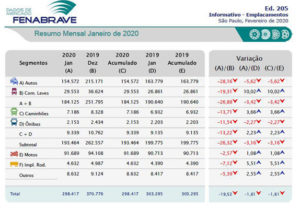 O segmento de automóveis e comerciais leves apresentou queda de 26,9% em janeiro, se comparado com dezembro, totalizando 184.125 unidades. Já na comparação com janeiro de 2019, quando foram comercializadas 190.640 veículos leves, houve retração de 3,4%.