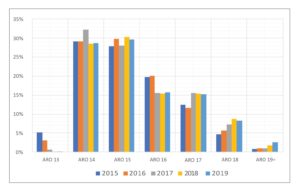 O aro 14 se manteve estável, porém com uma variação na banda de rodagem. As medidas 165 e 185 cresceram em detrimento da medida 175. A medida 185 dobrou sua participação nesse aro, passando de 16% para 33%.