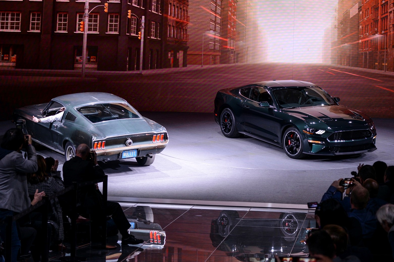 The new 2019 Mustang BULLITT shares the Ford stage at the North American International Auto Show with the original 1968 Mustang GT driven by legend Steve McQueen during filming on the movie “Bullitt.”