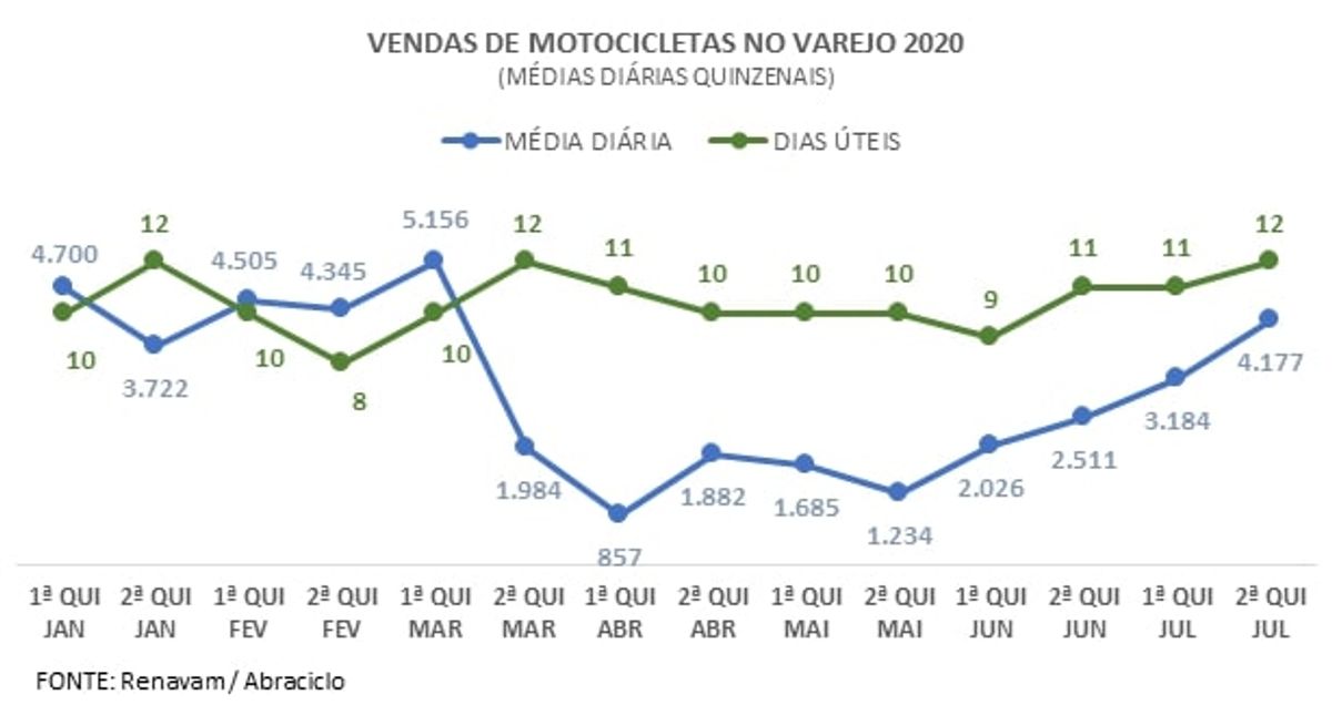 De acordo com o balanço da Abraciclo, no entanto, a média das vendas diárias vem registrando crescimento ao longo dos últimos três meses. Somente no recorte do mês passado em relação a junho, com 23 e 20 dias úteis, respectivamente, a alta foi de 61,4%, de 2,2 mil unidades para 3,7 mil motocicletas.