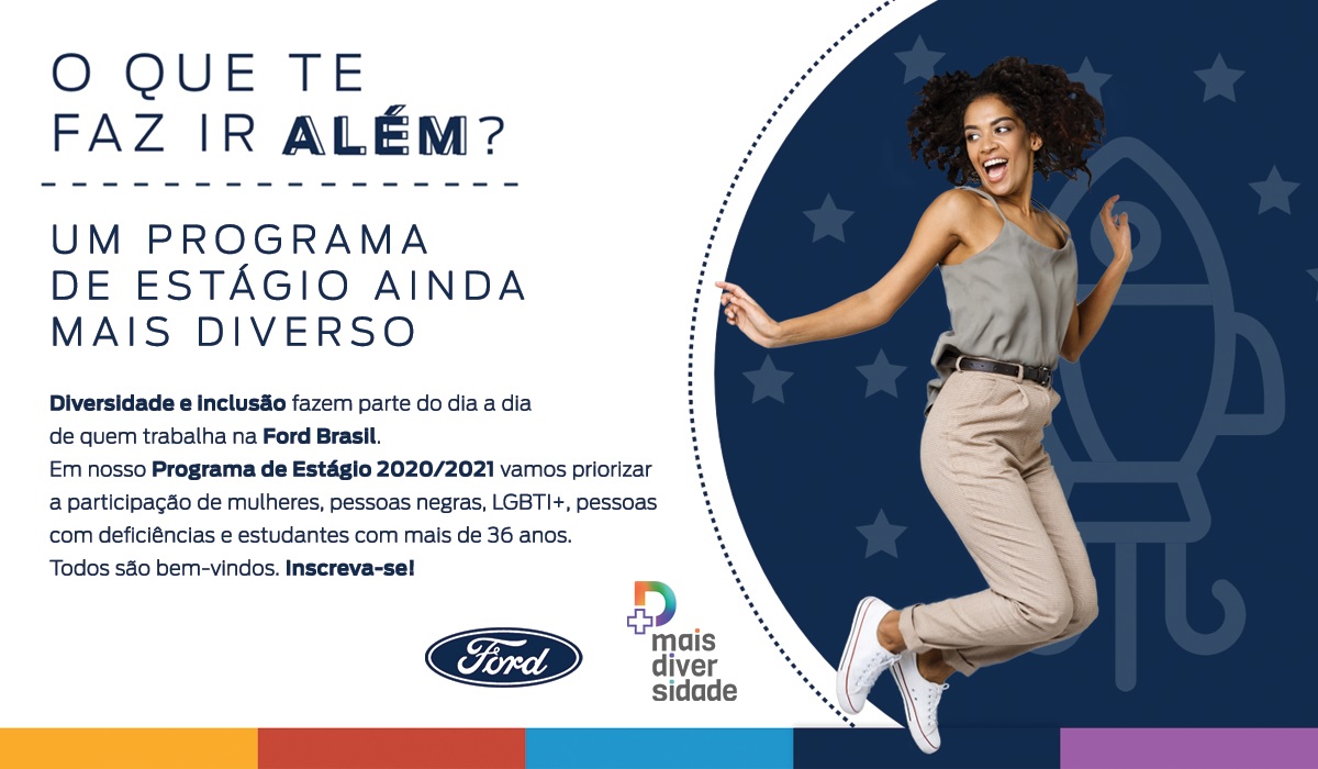 O Programa de Estágio 2020/2021 da Ford Brasil vai priorizar candidaturas de pessoas negras, LGBTI+, mulheres, pessoas com deficiência e estudantes com mais de 36 anos. São 50 vagas nas unidades de Camaçari, BA, São Paulo, Taubaté e Tatuí, SP, para estágios com duração de até dois anos nas áreas de Finanças, Serviço ao Cliente, Logística, Qualidade, Desenvolvimento do Produto, RH, Compras, Marketing, Vendas e Jurídico.
