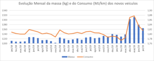 Nos meses imediatamente após o início da pandemia no Brasil, houve uma alteração no perfil de vendas que, se mantido, poderia causar dificuldades, já que foi registrado um aumento expressivo da massa e do consumo médio dos veículos novos comercializados (figura abaixo). A alteração no volume de veículos é, em parte, responsável por essa mudança, que além de tudo, ocorreu de forma desigual já que as medidas com relação à pandemia e aos efeitos do lockdown parcial nos principais centros do país foram diferentes. Mas, a partir de maio, este efeito já é uniforme em todo o País e mostra um retorno aos valores médios de antes da crise.