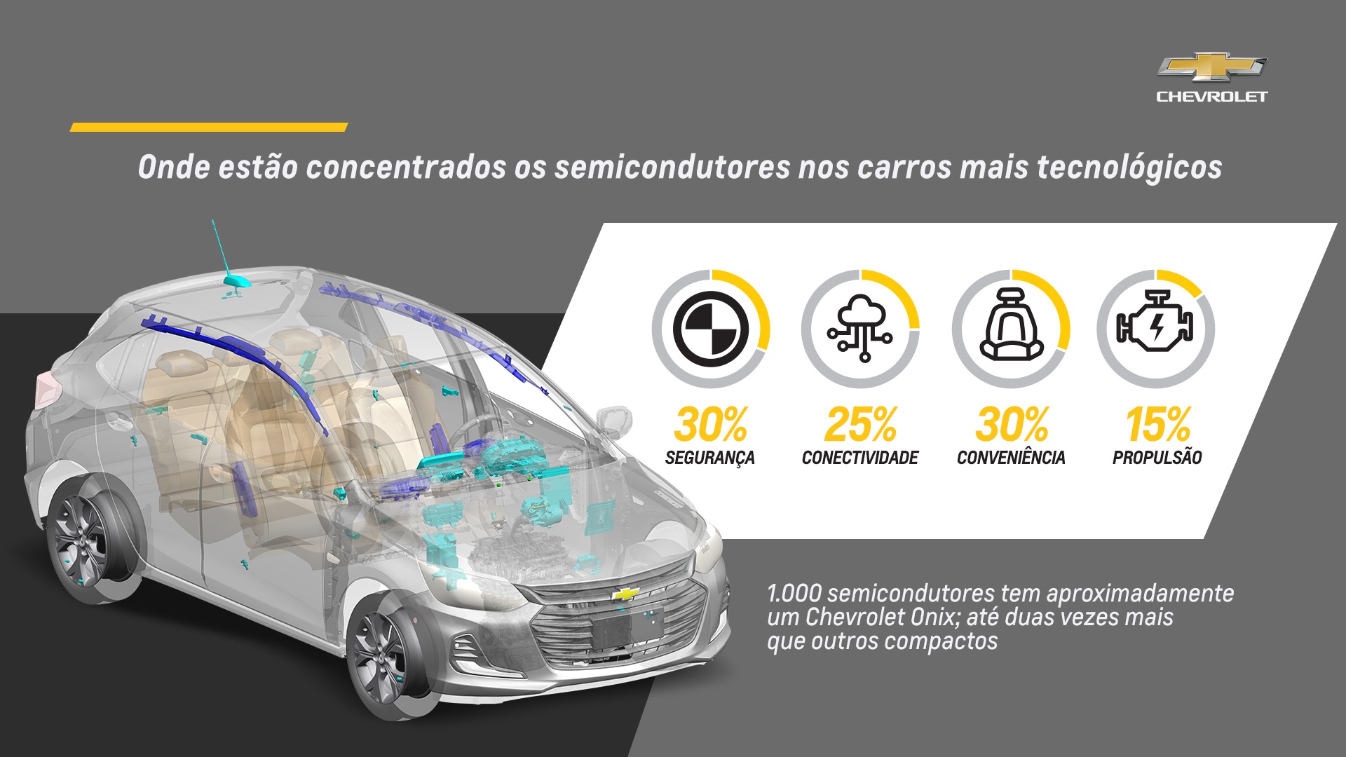 Levantamento divulgado pela Chevrolet nesta segunda-feira, 7, mostra que os semicondutores estão distribuídos da seguinte maneira em carros mais tecnológicos a combustão: 30% entre os sistemas de segurança, 30% entre os sistemas de conforto & conveniência, 25% entre os sistemas de conectividade e 15% entre os sistemas de propulsão.