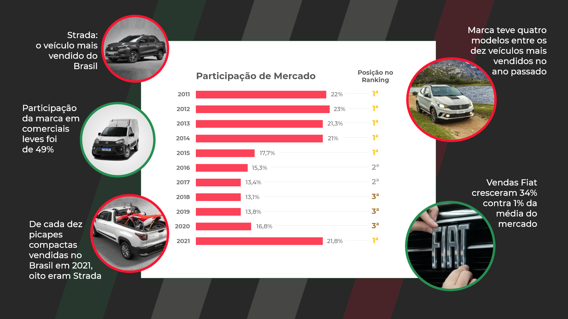 Além de praticamente repetir a participação alcançada naquele ano, em 2021 a Fiat repetiu o feito de ter quatro representantes entre os dez veículos mais vendidos. Mas foi além, com a Strada em primeiro lugar, ao ultrapassar 109,1 mil unidades comercializadas. Argo, com 84,6 mil licenciamentos, Toro, 70,9 mil, e Mobi, com 65,8 mil emplacamentos completaram o quarteto.