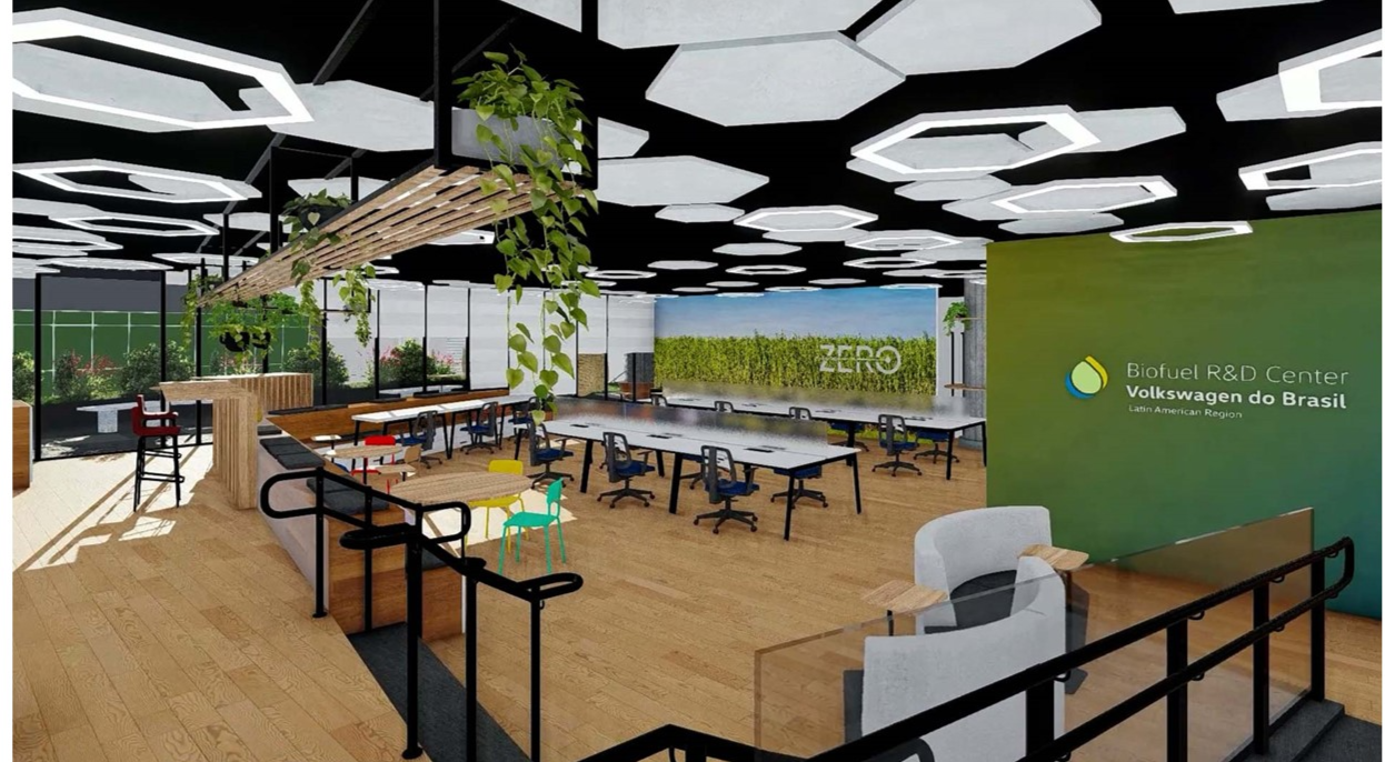 O conceito do novo Centro de P&D de biocombustíveis da Volkswagen é inspirado em coworkings, no qual a equipe trabalha em constante colaboração para estimular o desenvolvimento de soluções inovadoras. “O projeto considera também muita iluminação natural, o verde integrado ao ambiente e espaços flexíveis para utilização em diversas situações de interação dos times de trabalho”, informa a empresa.