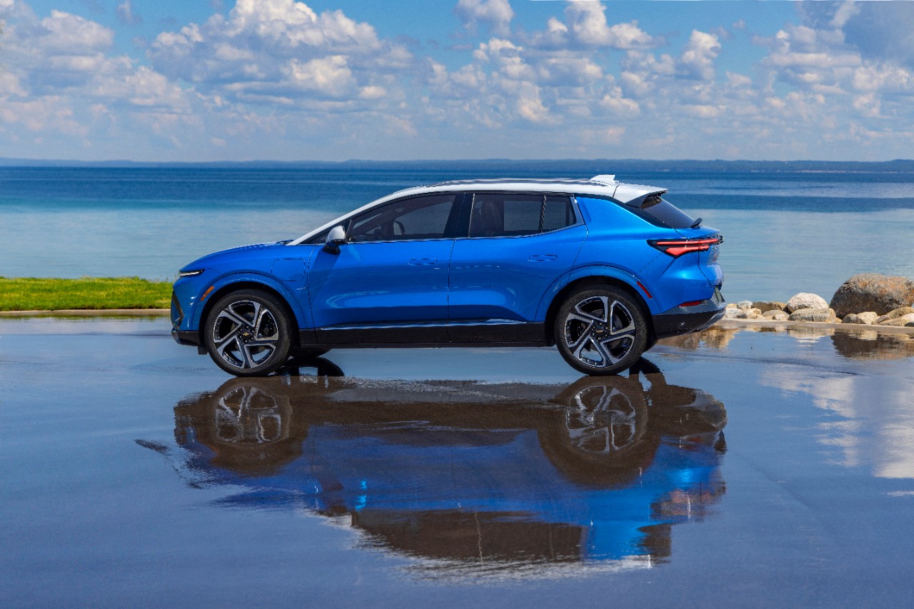 Driver’s side view of 2024 Chevrolet Equinox EV 3LT in Riptide Blue parked in front of a lake. Preproduction model shown. Actual production model may vary. 2024 Chevrolet Equinox EV available Fall 2023.