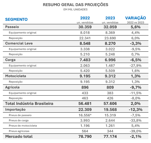 A Anip enxerga mais um período que registrará desempenho de pouco de crescimento. Pelas estimativas da associação dos fabricantes de pneus, as vendas em 2023 deverão somar 57,6 milhões de unidades, volume que se realizado, resultará em leve crescimento de 2% sobre o exercício de 2022.