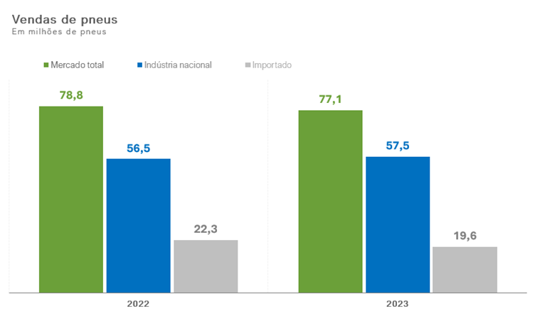 No ano passado, a indústria de pneus fechou com vendas de 56,5 milhões de unidades, volume praticamente estável em relação ao ano anterior, com ligeira queda de 0,2%.