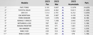 Em maio, a representante da Chevrolet somou 3.592 licenciamentos contra 3.986 da Hilux e 4.986 da Toro, mais uma vez a primeira colocada entre as picapes médias-grandes, segundo critério da Fenabrave.