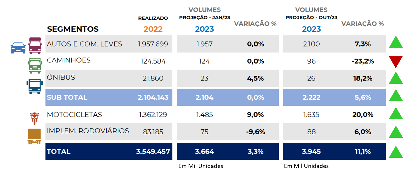A Fenabrave refez as projeções de venda de veículos para 2023 com um desempenho bem superior à percepção que tinha no começo do ano. Se antes apontava uma alta de 3,3% nos emplacamentos totais, considerando automóveis, comerciais leves, caminhões, ônibus, motocicletas e implementos rodoviários, agora espera um crescimento de 11%, para 3,94 milhões de licenciamentos.