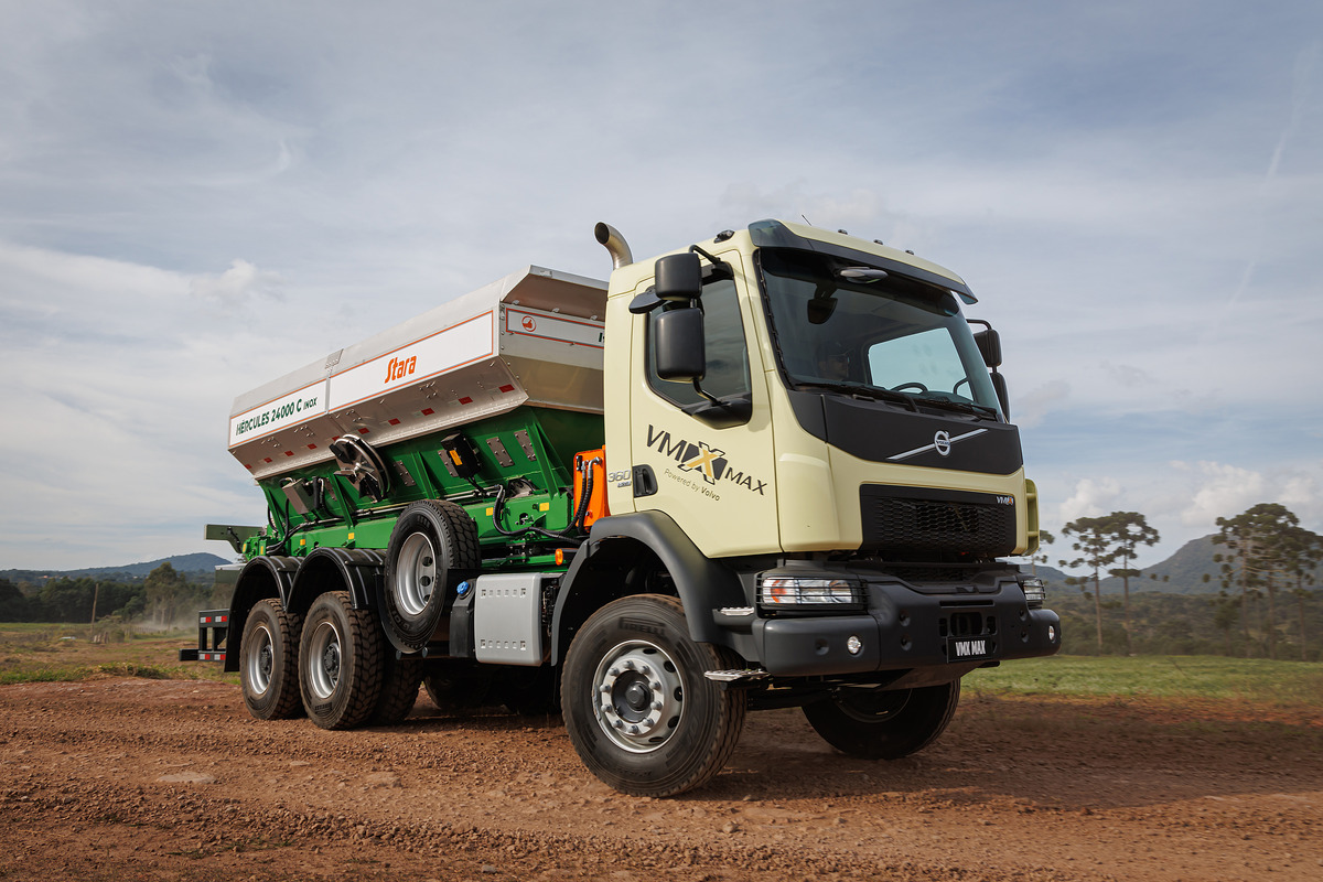 A Volvo encontrou mais uma aplicação para o VMX Max, versão da linha para tarefas fora de estrada. Ao receber um distribuidor de insumo, o Hercules 24000 C, da Stara, empresa de máquinas e implementos agrícolas, o caminhão se torna um substituto do trator na agricultura.
