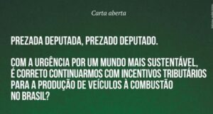 Com esse dinheiro, complementam, daria para construir 1,6 mil creches, 1,6 mil hospitais de campanha ou 2.550 escolas por ano. No título da carta (veja foto abaixo), dirigida aos deputados e deputadas, as três montadoras questionam: “Com a urgência por um mundo mais sustentável, é correto continuarmos com incentivos tributários para produção de veículos à combustão no Brasil”.