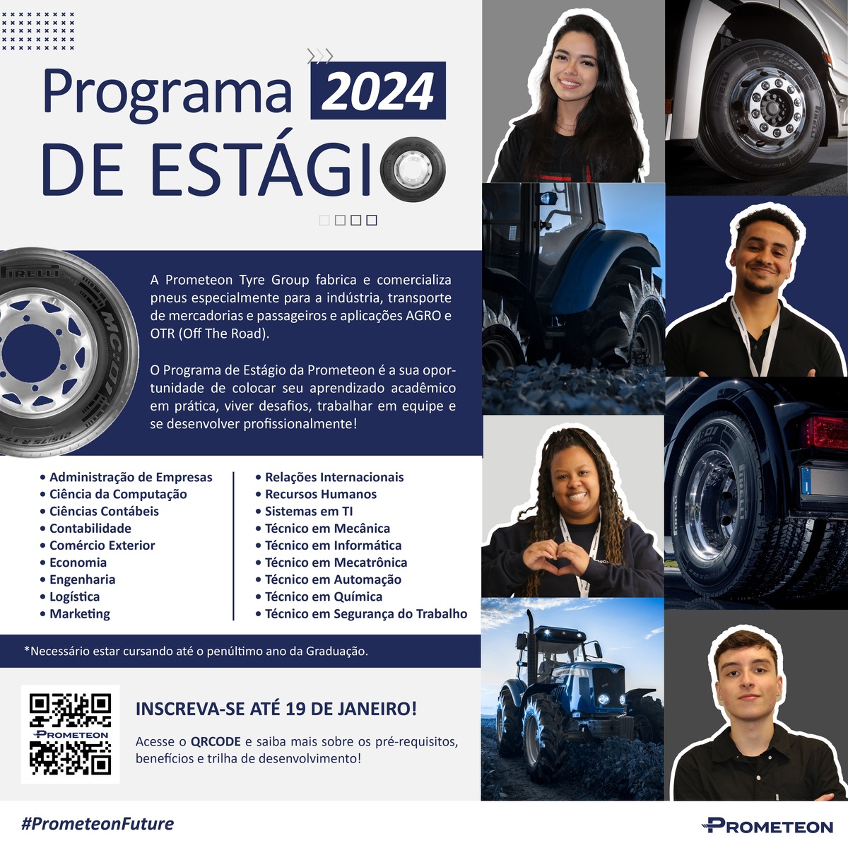 A Prometeon, fabricante de pneus para veículos comerciais, abriu inscrições para o Programa de Estágio 2024. A empresa oferece 40 vagas distribuídas nas operações de Santo André (SP) e Gravataí (RS).