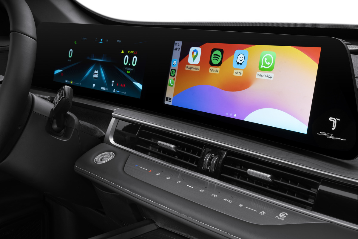 Ao entrar no veículo, a primeira mudança notável é o painel com uma tela curva de 24,6 polegadas que abriga quadro de instrumentos, central multimídia e GPS nativo. Dentre as diversas funções e programações que dispõe, as telas podem ser arrastadas pelo toque do dedo.