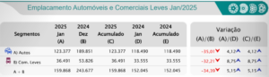 Merece destaque no primeiro mês de 2025 o desempenho dos veículos dotados de motorização híbrida. Foram licenciados 12,8 mil automóveis e comerciais leves com a tecnologia — 8% de participação —, um salto de 67% sobre os emplacamentos de janeiro de 2024.