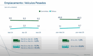 Somente em maio, foram fabricados 12,3 mil caminhões de todas as categorias, 10,3% acima de igual mês do ano passado. Os emplacamentos de 9,2 mil unidades no mês, entretanto, representaram queda de 4% na mesma comparação — com recuo de 1,1% ao longo de 2025.