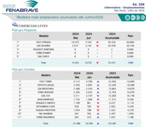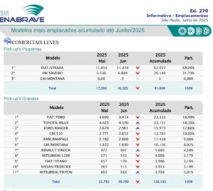 Considerando as picapes pequenas, médias e grandes, as vendas no semestre somaram 218.026 unidades, com expansão de 7,4% sobre as 202.974 do mesmo período de 2024. O segmento das pequenas saltou de 81.073 para 91.846 unidades, com a Fiat Strada na liderança e fatia de 68%.