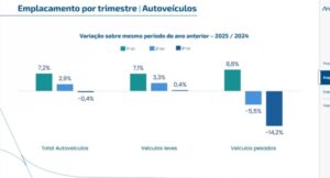 O comportamento do segmento de leves foi de altas de 7,1%, 3,2% e apenas 0,4%, na mesma ordem, enquanto nos pesados o índice foi positivo em 8,8% no primeiro trimestre, mas negativo nos dois período subsequentes, com queda de 5,5% e 14,2%.