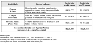 Quando comparado às opções de compra à vista e compra financiada, o “Hyundai Assina” pode representar uma economia de até 20% ao longo de três anos, calcula a montadora (ver quadro).