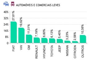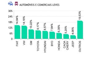 A Fenabrave revela o Top 9 das marcas mais vendidas no varejo e no atacado (tabelas abaixo). No primeiro caso, o ranking é complementado pela Hyundai, BTY, Honda, Caoa Chery e Jeep, cujas participações vão de 8,5% a 4% de cima para baixo.