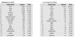 No mês de outubro, as marcas líderes no sesgmento de híbridos foram a BYD, GWM, Fiat e Toyota. No caso dos elétricos, o ranking tem a BYD no topo, seguida da Volvo e da General Motors (veja tabelas abaixo).