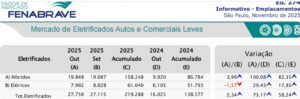 Apesar de crescimento ainda expressivo no acumulado do ano, da ordem de 58,2% em relação aos primeiros dez meses de 2024, a venda de carros e comerciais leves eletrificados mostra estabilidade no comparativo mensal.