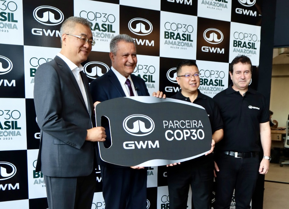A GWM forneceu 100 veículos eletrificados à COP30. Andy Zhang, presidente da GWM Brasil & México, e Ricardo Bastos, Diretor de Assuntos Institucionais da GWM Brasil, fizeram a entrega simbólica em Belém, PA, ao Ministro da Casa Civil, Rui Costa.