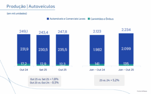 Indicador mais importante do atual quadro é a somatória dos dez primeiros meses de 2025.  Nesse período, a produção acumulada superou 2,23 milhões de veículos leves e pesados, crescimento de 5,2% diante do resultado de janeiro a outubro do ano passado.