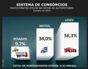 O consórcio de veículos seguiu em alta em outubro e superou 3 milhões de cotas comercializadas no ano, com 8,3% de avanço sobre o mesmo período de 2024. Foram R$ 181,7 bilhões em créditos comercializados, alta de 17% sobre o total de R$ 155,3 bilhões do ano anterior.