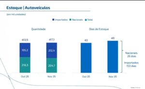 O balanço foi divulgado nesta segunda-feira, 8, pelo presidente da Anfavea, Igor Calvet, que destacou o aumento do estoque de produtos importados no mercado brasileiro, que saltou de 195,2 mil para 212,4 mil unidades de outubro para novembro, o equivalente a cinco meses de venda desses produtos.