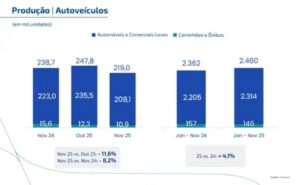 A produção de 219 mil veículos em novembro, com queda de 8,2% sobre o mesmo mês de 2024, gerou um acumulado no ano de 2,46 milhões de unidades, o que representou alta de apenas 4,1% sobre total de 2,36 milhões em idêntico período do ano passado.