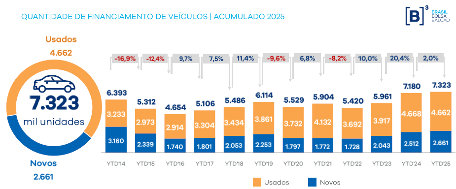 Os financiamentos de veículos registraram novo crescimento no ano passado, para 7,3 milhões de unidades novas e usadas, segundo levantamento da B3. O número representa aumento de 2% em relação a 2024 e se trata do melhor resultado anual desde 2011.