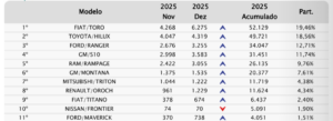 Curiosamente, o recuo agora se deu em um 2025 de lançamentos e atualizações importantes de várias marcas e veículos e com as duas picapes líderes em ligeiro declínio também.