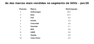 A Jeep foi a segunda marca que mais vendeu SUVs no mês passado, com participação de 11,5%, seguida pela coirmã de Stellantis Fiat, que respondeu por 9,2%.