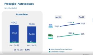 Foram embarcadas 59,4 mil unidades no período, recuo de 28% ante o mesmo bimestre de 2025. Com isso, a produção acumulada nos dois primeiros meses desacelerou 8,9%, baixando de 404 mil para 368 mil unidades no comparativo interanual.