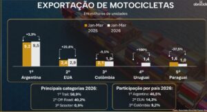 No ranking das exportações (veja tabela abaixo), uma das novidades em 2026 é a Colômbia perdendo a vice-liderança para os Estados Unidos, que ampliaram compras em 20,8%, atingindo 2,9 mil unidades nos primeiros três meses do ano.