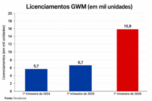 A GWM encerrou o primeiro trimestre de 2026 entre as marcas de maior volume que mais cresceram no Brasil. Os 15,9 mil licenciamentos de automóveis e comerciais leves registrados representam um nada modesto salto de quase 140% frente aos 6,7 mil veículos negociados em igual período do ano passado.